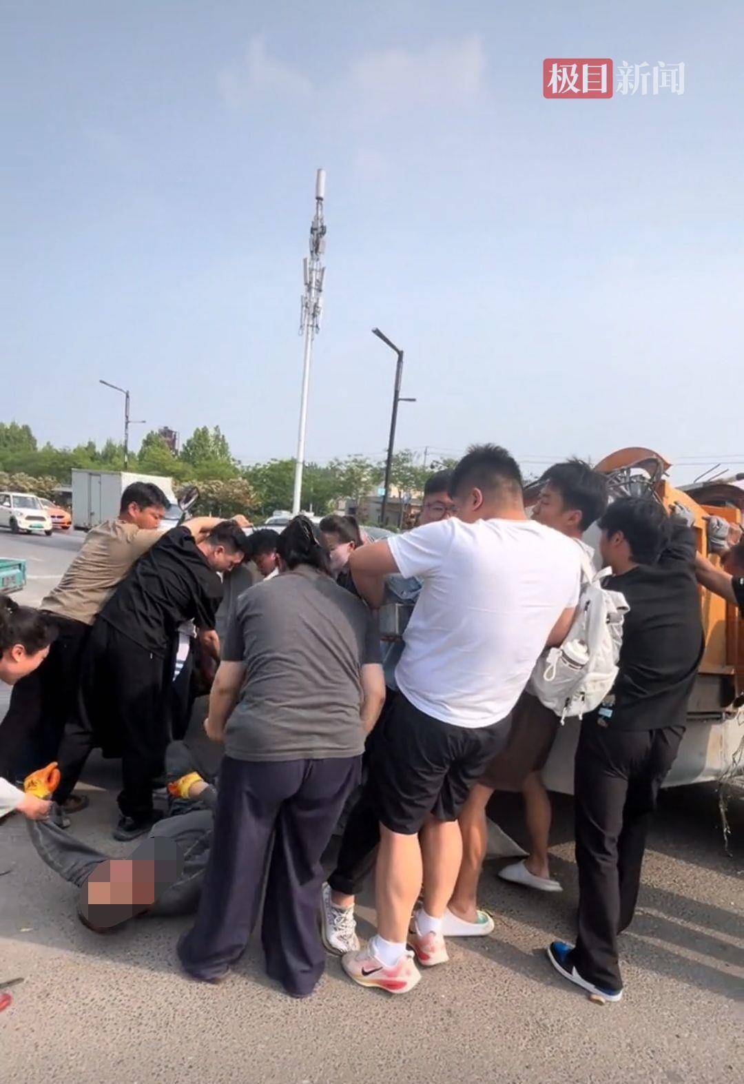 环卫工大爷开车侧翻被困,热心群众帮忙抬车救人(受访者供图)