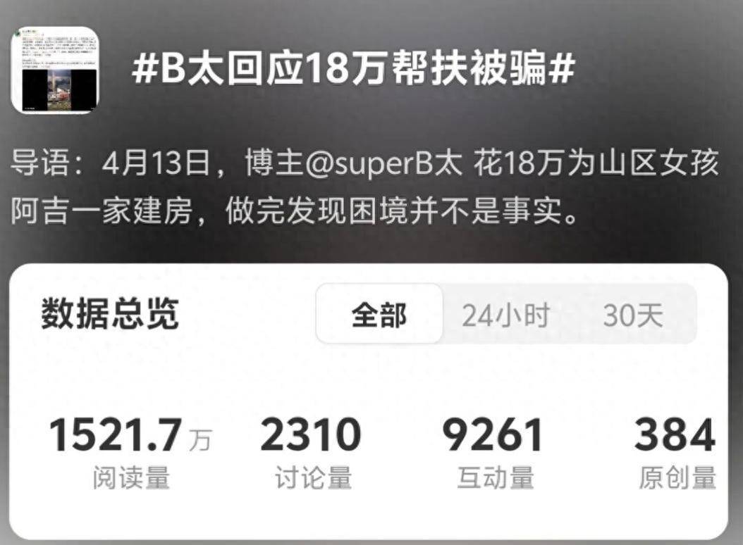 4月13日,知名公益博主B太发视频称,花18万为山区女孩阿吉一家建房,完成后发现他们的困境并不是事实,相关话题登上热搜。